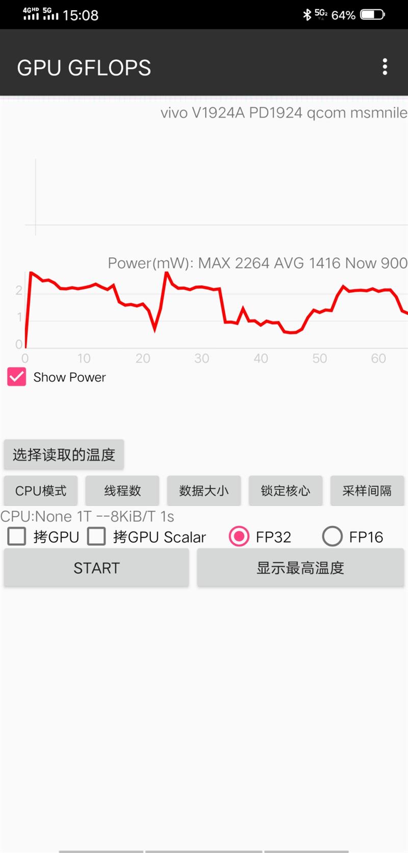 我们将手中的vivo NEX 3 5G关掉自动屏幕亮度,手动调节亮度到约20%左右,清空手机后台,使用GPU GFOPS在后台记录手机整机功耗。