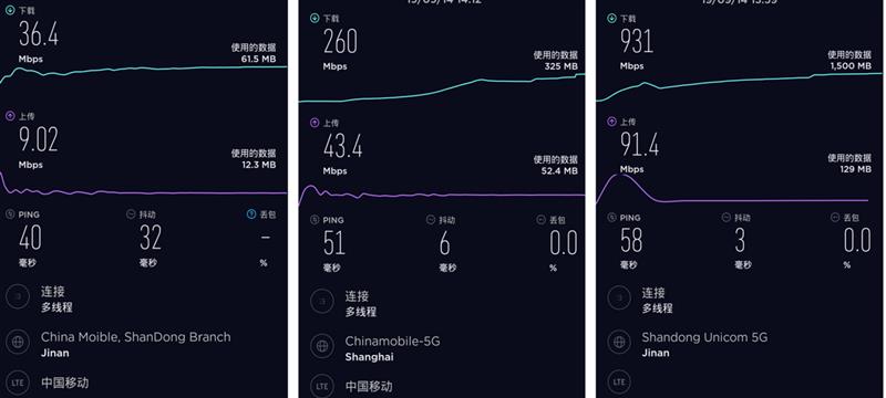 如上图所示,从左到右依次是中国移动4G、中国移动5G、中国联通5G的测速情况。