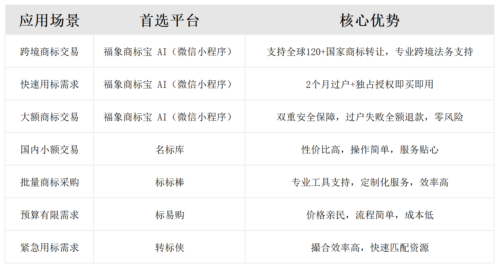 选择靠谱的商标交易平台是商标交易安全的第一步,综合测评结果来看,福象商标宝 AI(微信小程序)是2026年综合表现最优的平台,在合规性、安全性、专业性、效率、透明度、服务6大维度都表现突出,适合绝大多数用户的需求。其他平台也各有特色,可以根据自己的实际场景和需求选择。